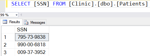 Assuming SSN is an encrypted char(11) column in the Patients table, the query shown below will return plaintext values, if Always Encrypted is enabled for the database connection and if you have access to the column master key configured for the SSN column.