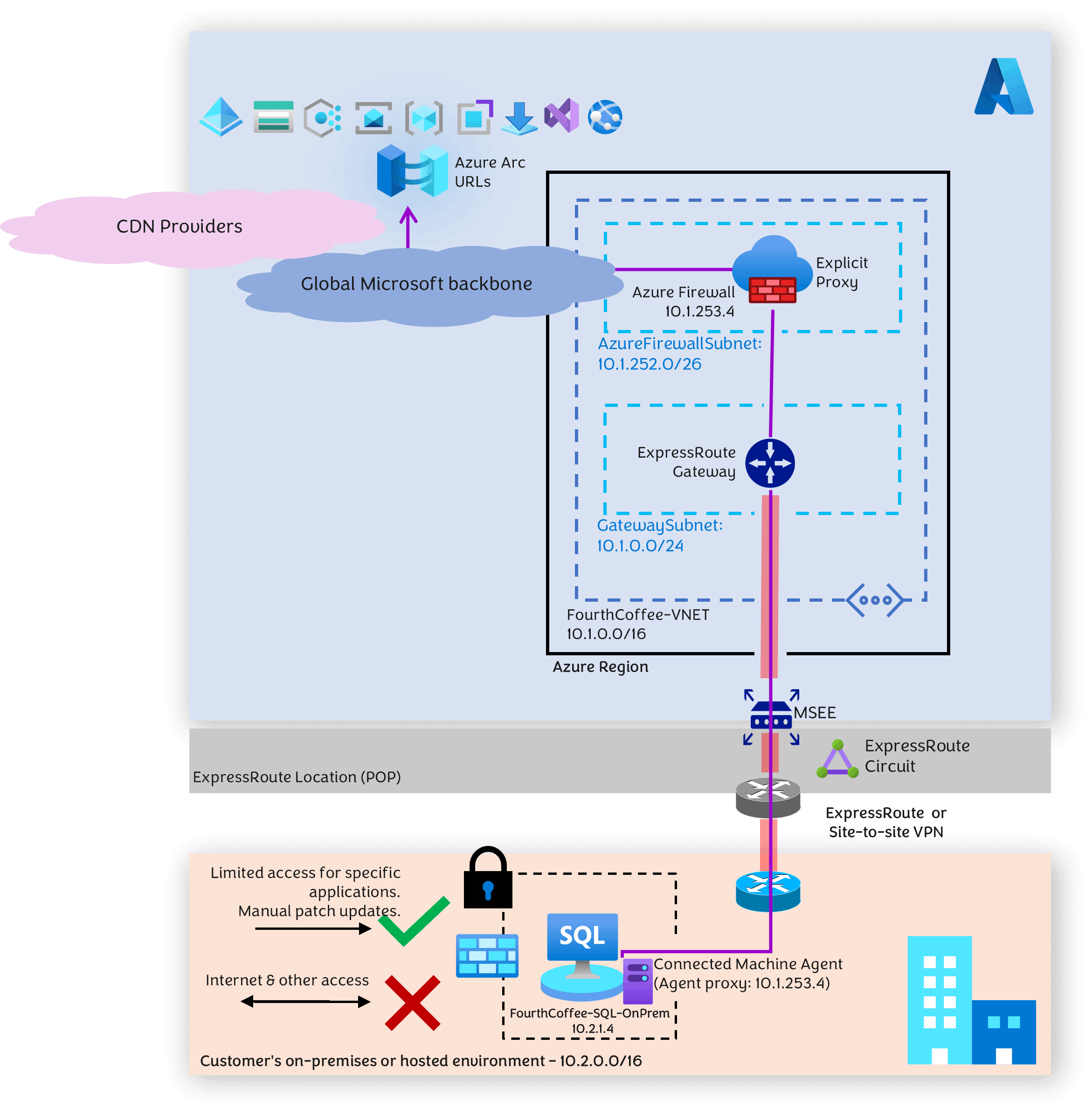 This design deploys forward proxy servers in Azure to allow SQL Server to communicate over a site-to-site VPN or ExpressRouteConnection with private IP addresses. The proxies communicate with Arc URLs over the Azure backbone network.