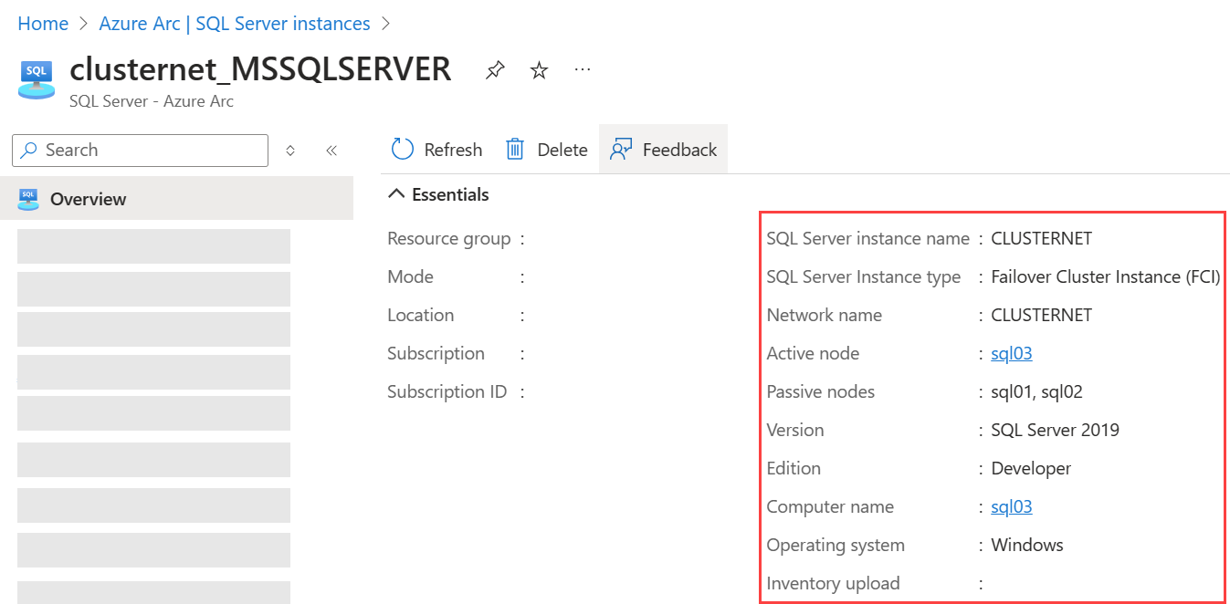 Screenshot of Azure portal for failover cluster instance enabled by Azure Arc.