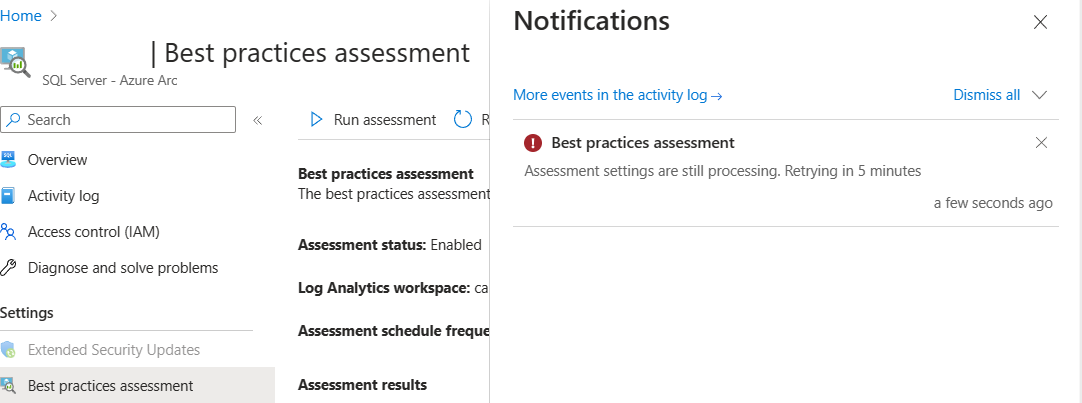 PATCHcall to the API, to update the Azure extension for SQL Server assessment settings.PATCH https://management.azure.com/subscriptions/ <subscription-id>/resourceGroups/<resource-group-name>/providers/Microsoft.HybridCompute/machines/<arc-resource-name>/extensions/WindowsAgent.SqlServer?api-version=2022-08-11-previewGo to Best Practices Assessment on your Arc-enabled SQL Server resource page in the Azure portal and re-enable best practices assessment and select a new log analytics workspace.