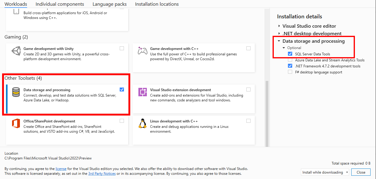 3. Select SQL Server Data Tools under Data storage and processing in the list of workloads.