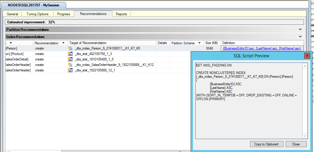 MySessionRecommendations.sqlscript in the Query Editor of SQL Server Management Studio to view it. You could apply the recommendations to theAdventureWorks2025sample database by executing the script in the Query Editor, but don't do this. Close the script in Query Editor without running it.As an alternative, you could also apply the recommendations by selecting Apply Recommendations on the Actions menu of Database Engine Tuning Advisor, but don't apply these recommendations now in this practice.
