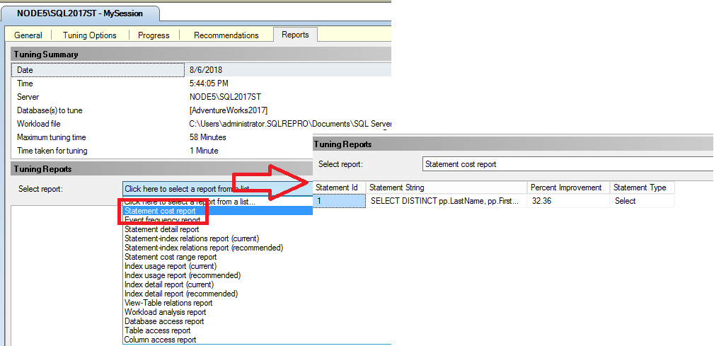 In the Tuning Reports pane, select Statement cost report in the Select report list. If you need more space to view the report, drag the Session Monitor pane border to the left. Each Transact-SQL statement that executes against a table in your database has a performance cost associated with it. Reduce this performance cost by creating effective indexes on frequently accessed columns in a table. This report shows the estimated percentage improvement between the original cost of executing a statement in the workload and the cost if the tuning recommendation is implemented. The amount of information contained in the report is based on the length and complexity of the workload.