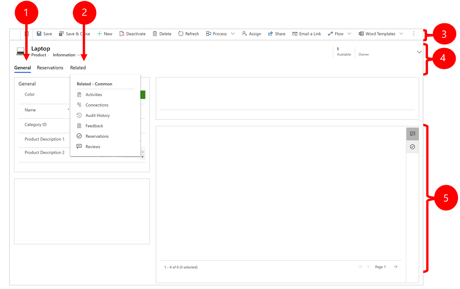 Related: The related tab displays provide access to all the different types of records that are related to the current record. For example, an Account may have multiple contacts, quotes, orders, and invoices associated with it. The related tab provides access to those related records. This tab is a drop-down list that you can use to find other types of rows that use or reference the displayed row. When you choose a table name from the Related drop-down list, a new tab named for that table opens, showing a list of all related rows of that type. The Related tab remains available, and you can still use it to find other types of rows that reference the table.