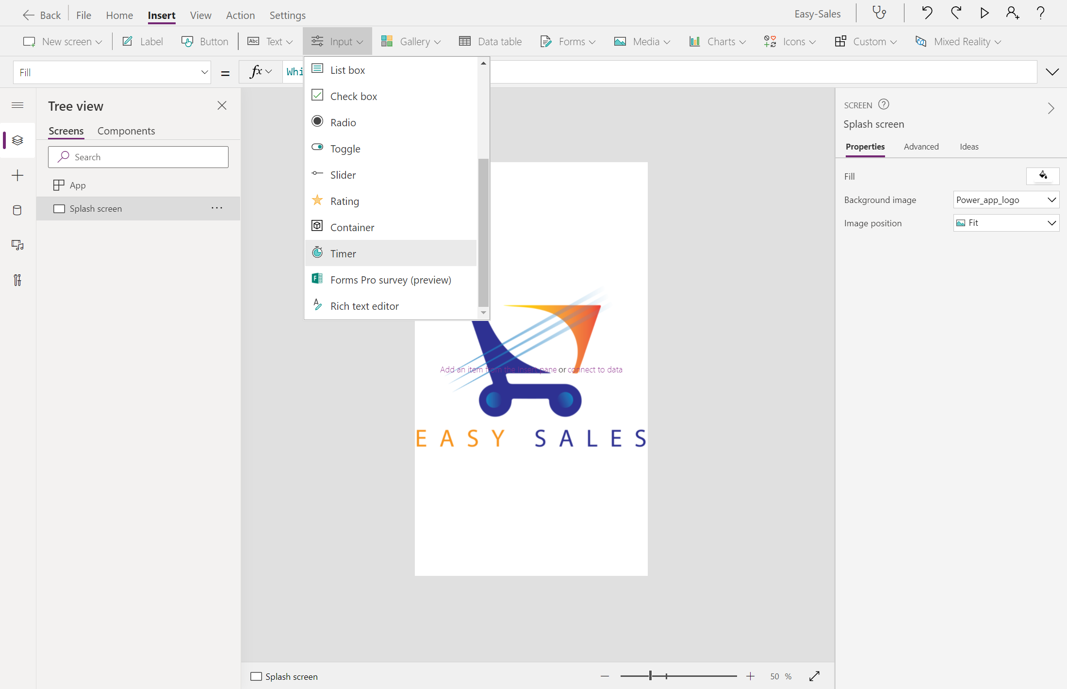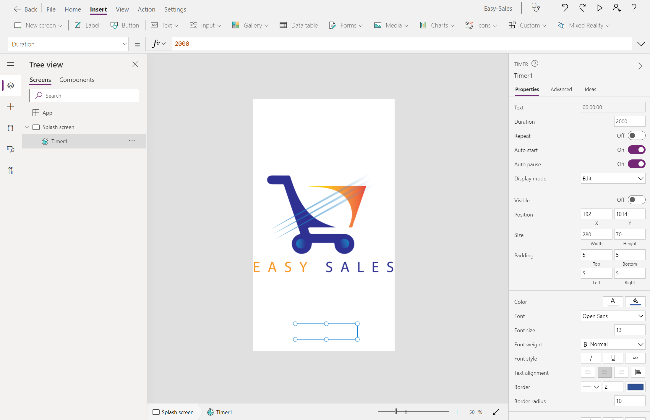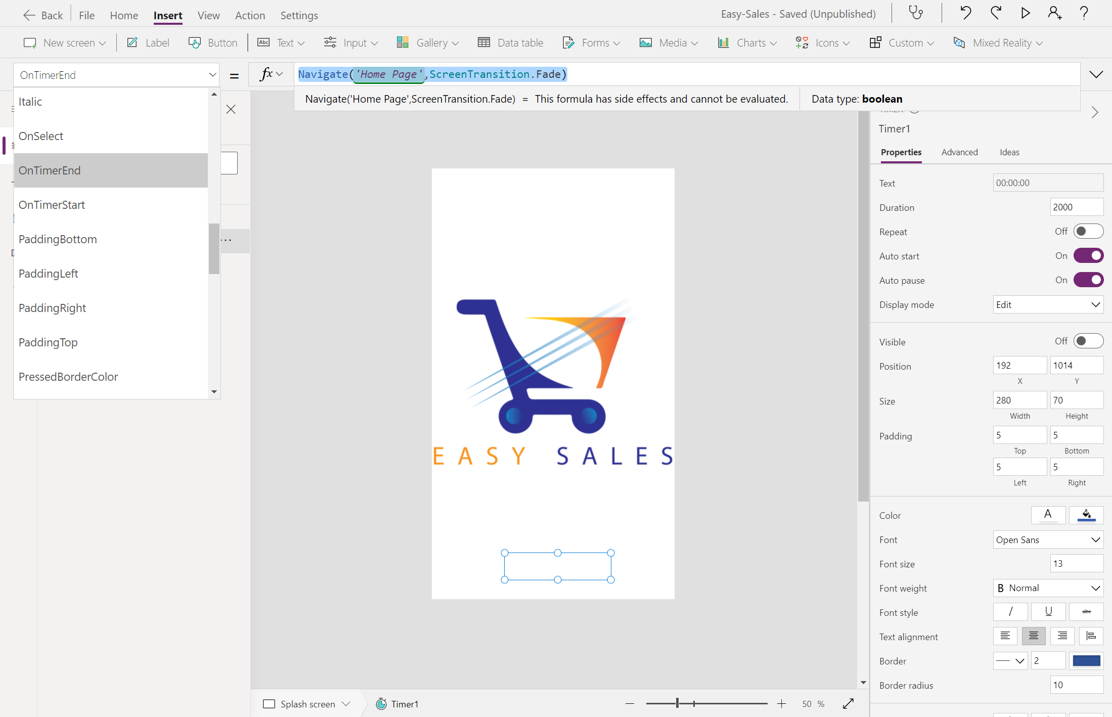 เราต้องการให้สามารถมองเห็นหน้าจอเริ่มต้นได้เพียงสองวินาทีเท่านั้น จากนั้นจึงเปลี่ยนไปยังหน้าแรก สร้างหน้าจอว่างอย่างที่เราทําในขั้นตอนก่อนหน้า และเปลี่ยนชื่อเป็น โฮมเพจ หลังจากนั้น เลือกปุ่มตัวจับเวลาที่เพิ่มไปยังหน้าจอ Splash และกําหนดค่าคุณสมบัติ OnTimerEnd แทนที่ false ด้วยเนื้อหาต่อไปนี้: