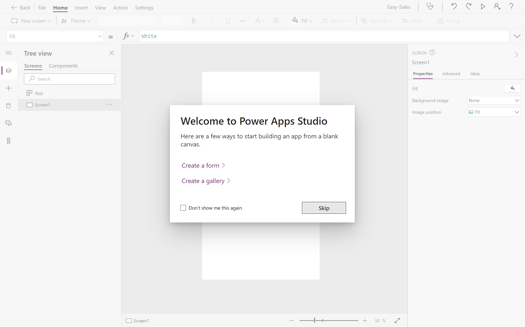 ถ้ากล่องโต้ตอบ ยินดีต้อนรับสู่ Power Apps Studio เปิดขึ้น ให้เลือก ข้าม