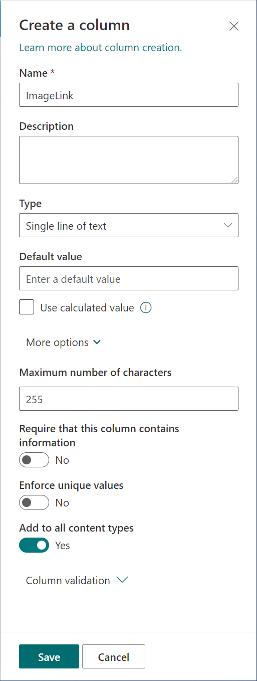 ป้อนรายละเอียดของคอลัมน์ในแท็บ สร้างคอลัมน์ และเลือก บันทึก
