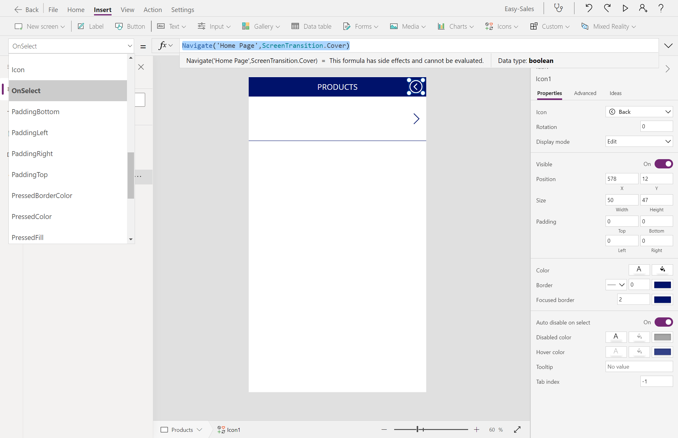 จัดตําแหน่งไอคอน ย้อนกลับ อย่างถูกต้องและเปลี่ยนสีที่แสดง ถ้าจําเป็น กําหนดค่าคุณสมบัติ OnSelect โดยการเพิ่มรายการต่อไปนี้: