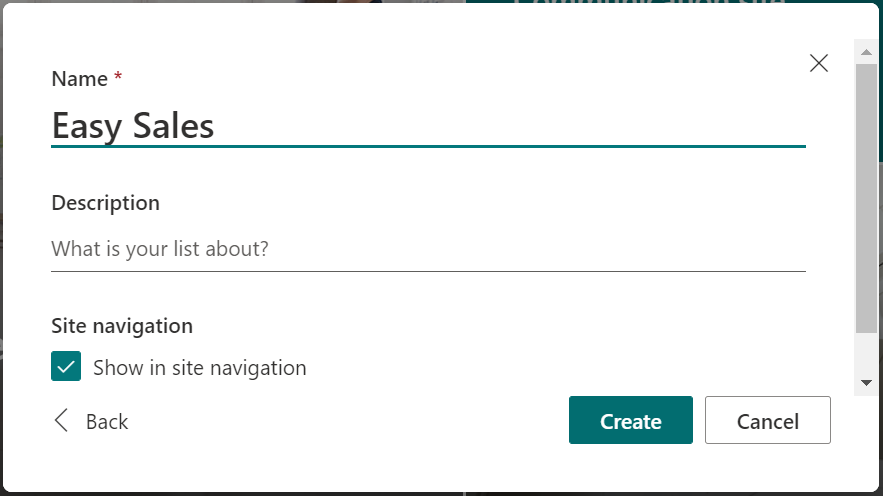 ในไซต์ SharePoint ที่สร้างขึ้นใหม่ภายใต้ชื่อ Easy Sales เลือกรายการดรอปดาวน์ + ใหม่ จากนั้นเลือก รายการ เพื่อสร้างรายการ SharePoint ของคุณ