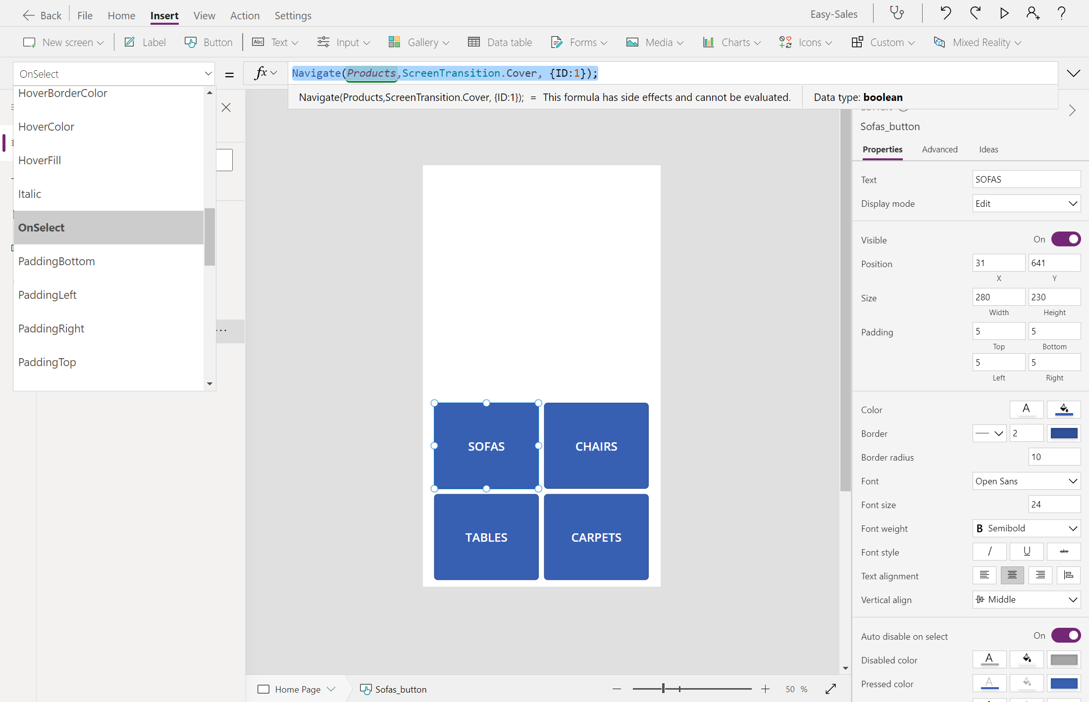 เลือกปุ่ม Sofas_button ที่สร้างขึ้นใหม่และกําหนดค่าคุณสมบัติ OnSelect หลังจากเลือกปุ่มแล้วจะต้องนําเราไปยังหน้ารายการผลิตภัณฑ์ที่สร้างขึ้นในขั้นตอนก่อนหน้า แทนที่ false ด้วยโค้ดต่อไปนี้: