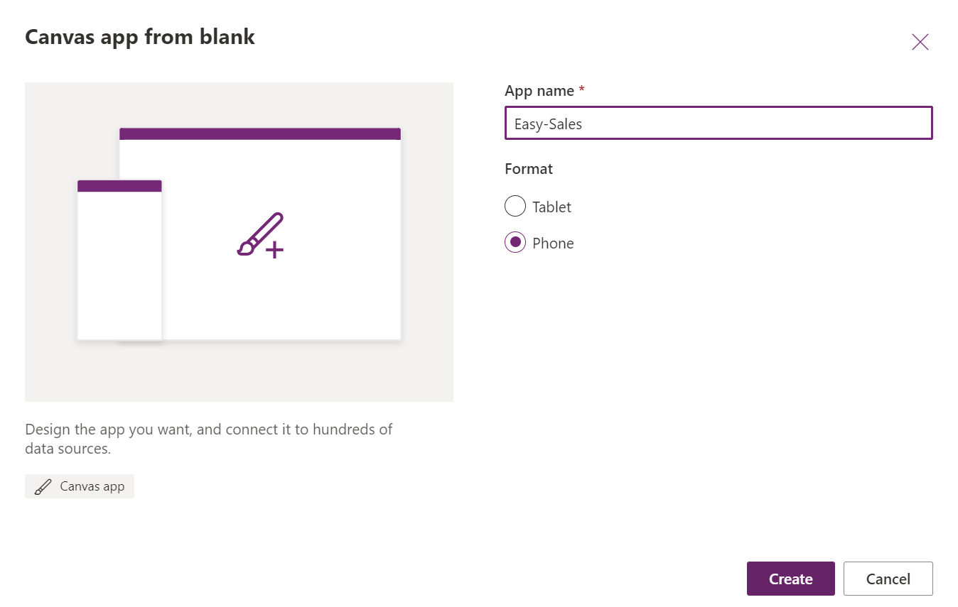 ระบุชื่อสําหรับแอปของคุณ ตัวอย่างเช่น Easy-Sales เลือก โทรศัพท์ จากนั้นเลือก สร้าง