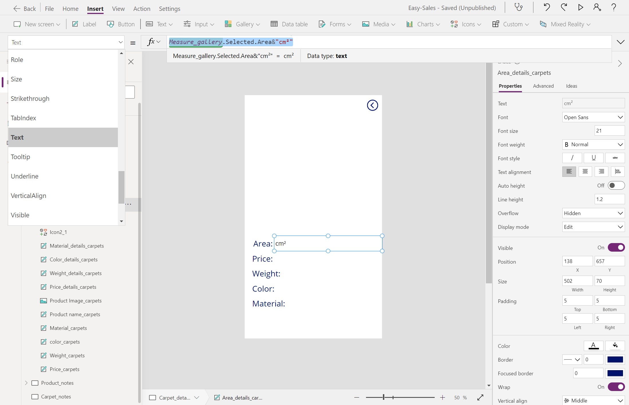 Measure_gallery.Selected.Area&"cm²"กําหนดค่าป้ายชื่อถัดจากป้ายชื่อ ราคา ดังนี้เพื่อแสดงราคาจากการคํานวณ: