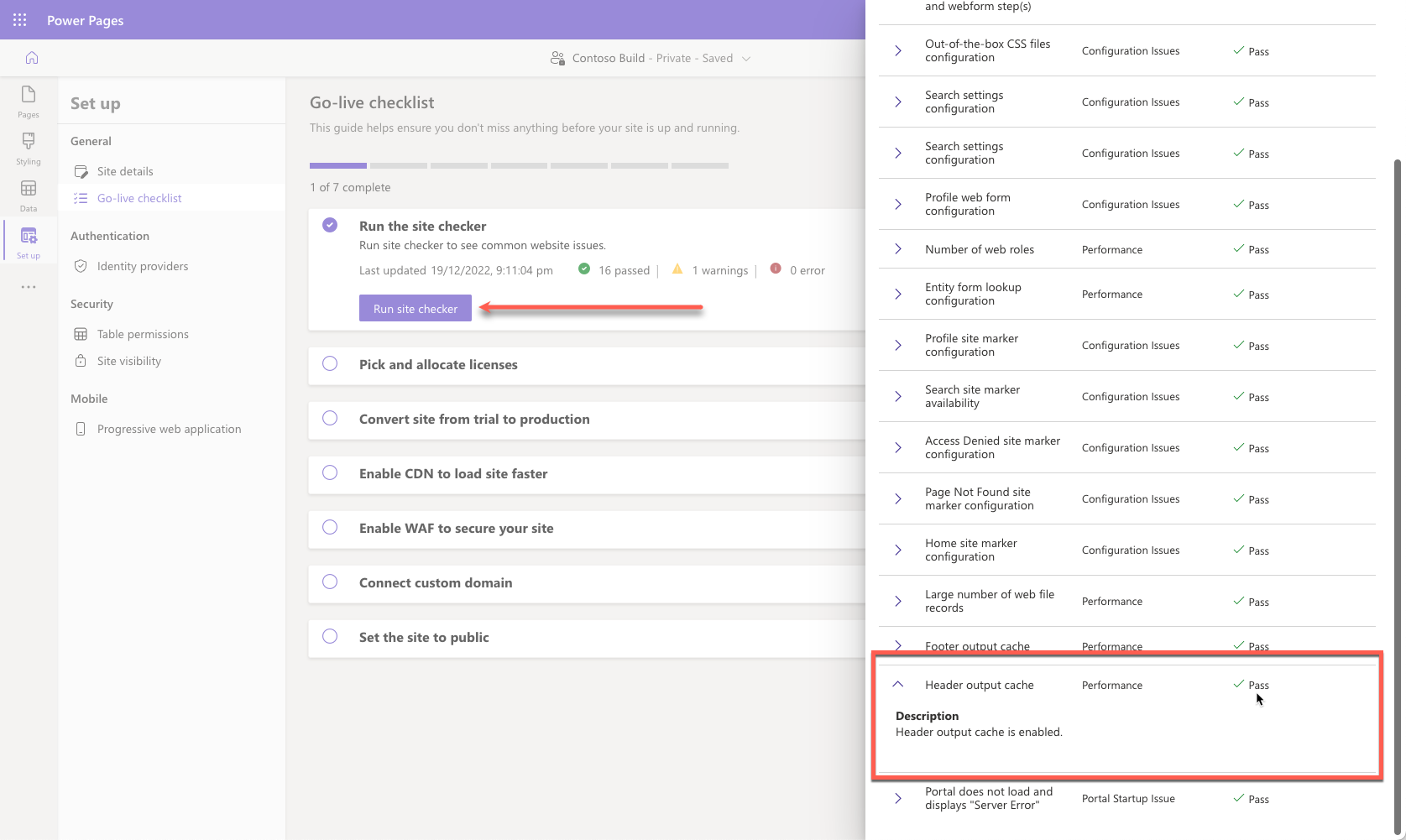 Your company has completed the Power Pages site development and wants to make the site available to the public. Prior to going live, they want to ensure that the site passes all site checker tests.