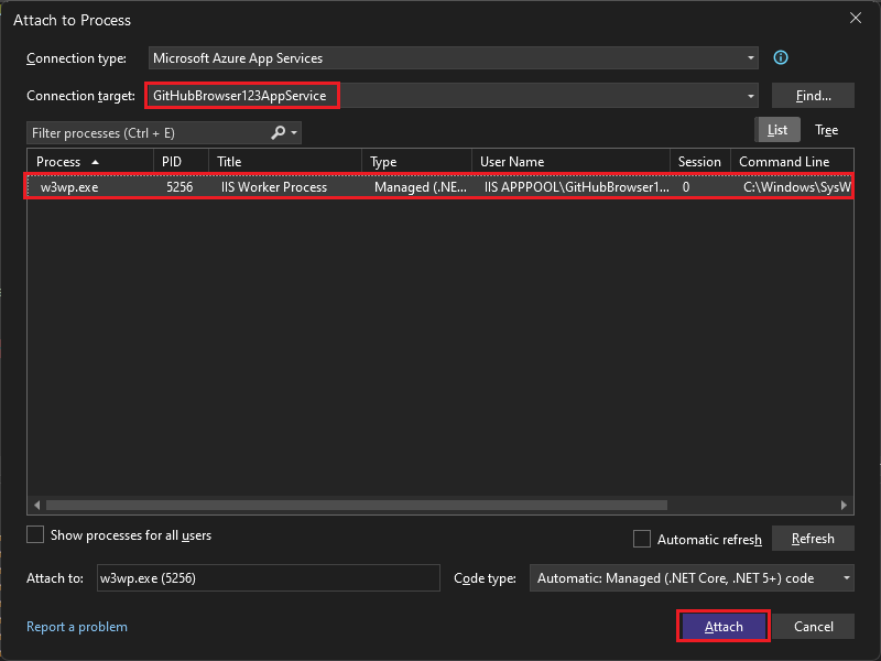 5. The w3wp.exe process should appear in the list of available processes to connect to. w3wp.exe is the main process of the Azure App Service that hosts the deployed application. Select the w3wp.exe process and then choose Attach in the bottom right.
