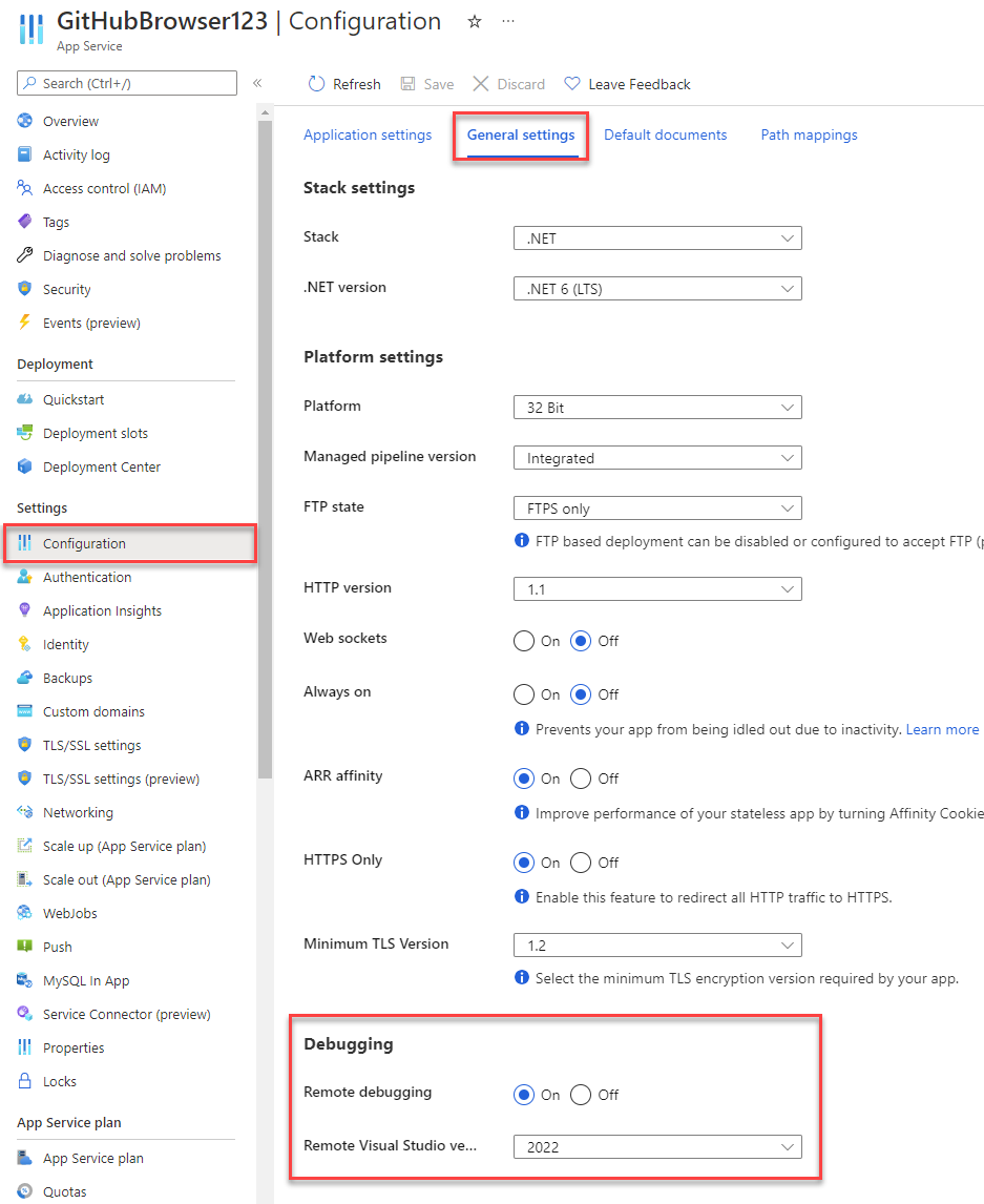 Before you can debug this issue with Visual Studio, you must enable the remote debugging feature on the App Service. This setting allows the Visual Studio debugger to connect to the main App Service web hosting process.