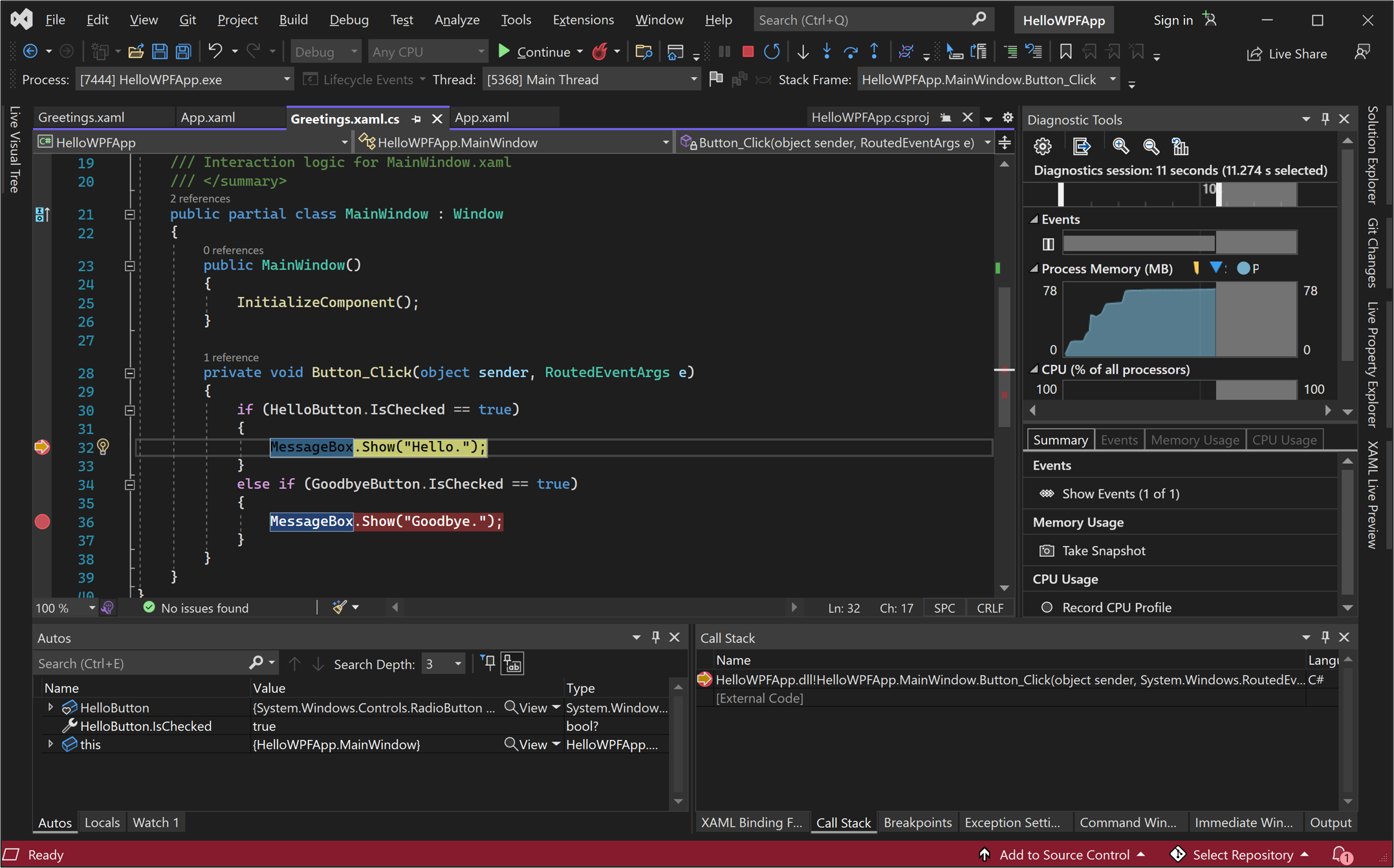 MessageBox.Show("Goodbye.").Press the F9 key to add a breakpoint, and then select F5 to start debugging.