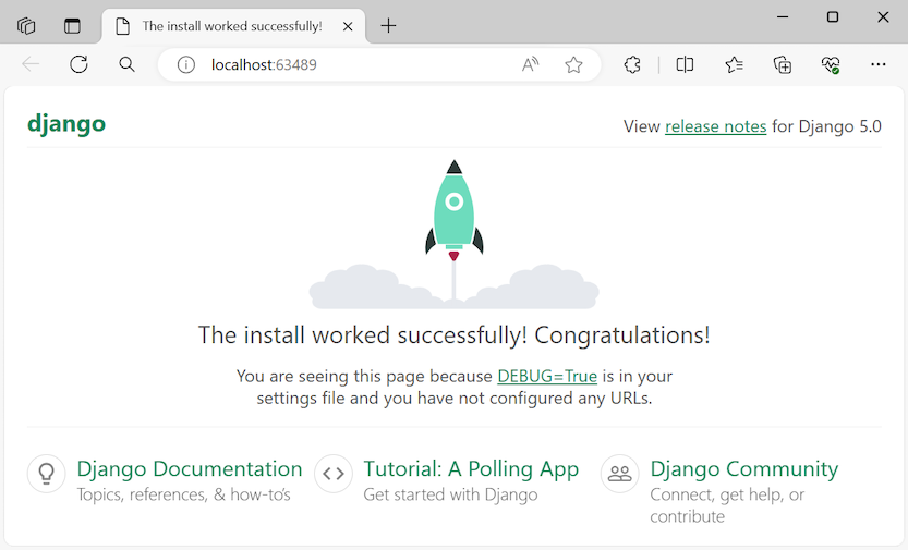 http://localhost:<port>. Because your Django project has no apps, Django shows only a default page to confirm the current code is working as expected.When you're done, close the console window, which stops the Django development server. You can also select Debug > Stop Debugging.