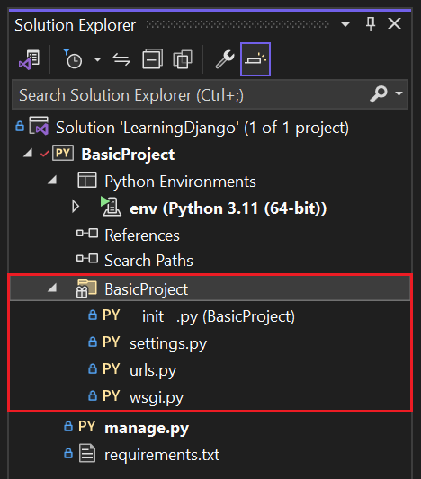 Open Solution Explorer to view your solution and project files. The initial project contains only two files, manage.py and requirements.txt: