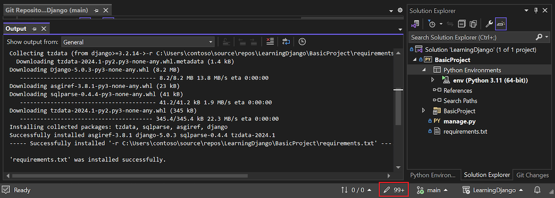 envis a standard convention.)If Visual Studio prompts for administrator privileges, provide your consent. Wait several minutes while Visual Studio downloads and installs packages. For Django and its dependencies, the process can require expanding close to 1,000 files in over 100 subfolders. You can view the progress in the Visual Studio Output window.