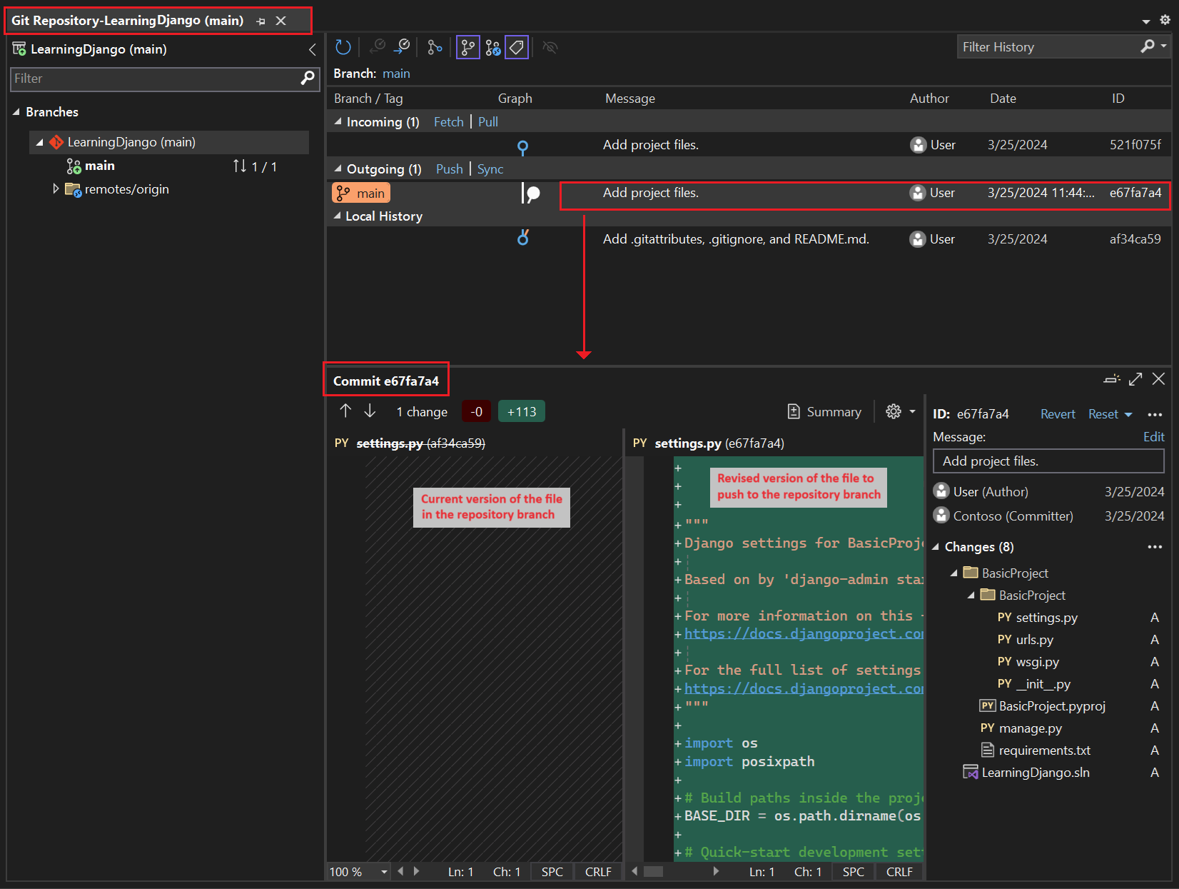 To see the differences view for the file, select a commit in the middle pane. The previous version displays on the left side and the revised version shows on the right side. The details also contain the change author, the change committer, and commit message.