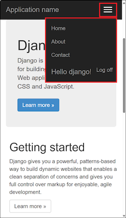 The app created by the Django Web Project template uses Bootstrap for responsive layout that accommodates mobile form factors. To see this responsiveness, resize the browser to a narrow view so the content renders vertically, and the navigation bar turns into a menu icon: