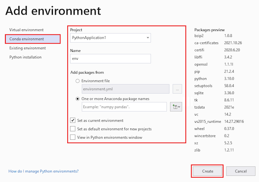 The package list instructs conda to create a Python environment. To install the latest version of Python, use thepythoncommand. To install a specific version, use the commandpython=,major>.<minor>as inpython=3.7. You can also use the package button to select Python versions and common packages from a series of menus.Set as current environment Activates the new environment in the selected project after the environment is created. Set as default environment for new projects Automatically sets and activates the conda environment in any new projects created in Visual Studio. This option is the same as using the Make this the default environment for new projects in the Python Environments window. View in Python Environments window Specifies whether to show the Python Environments window after creating the environment. Important