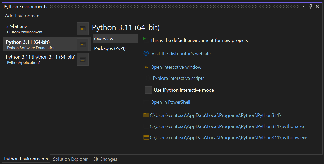 When you select an environment in the list, Visual Studio displays various properties and commands for that environment on the Overview tab of the Python Environments window, such as the interpreter location. The commands at the bottom of the Overview tab each open a command prompt with the interpreter running. For more information, see Python Environments window tab reference - Overview.