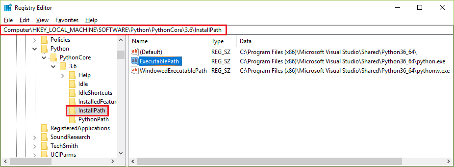 Python version Folder 64-bit version HKEY_LOCAL_MACHINE\SOFTWARE\Python or HKEY_CURRENT_USER\Software\Python 32-bit version HKEY_LOCAL_MACHINE\SOFTWARE\WOW6432Node\Python IronPython IronPython Expand the distribution and version node structure for your environment: