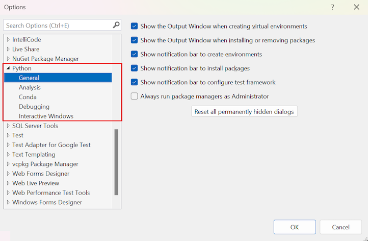 Under Tools > Options > Python, you can set Python-specific options for the general environment including Interactive Windows, conda environments, debugging, and more.