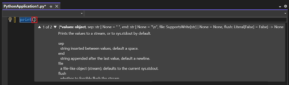 print.As you enter the function name, Visual Studio IntelliSense displays autocompletion options for your code. The default completion option is highlighted: