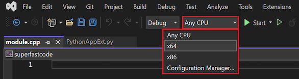 - For the C++ project (superfastcode or superfastcode2), change the target configuration to match your Python installation. For example, if your C++ project target configuration is Win32, but your Python installation is 64-bit, change the C++ project target configuration to x64.