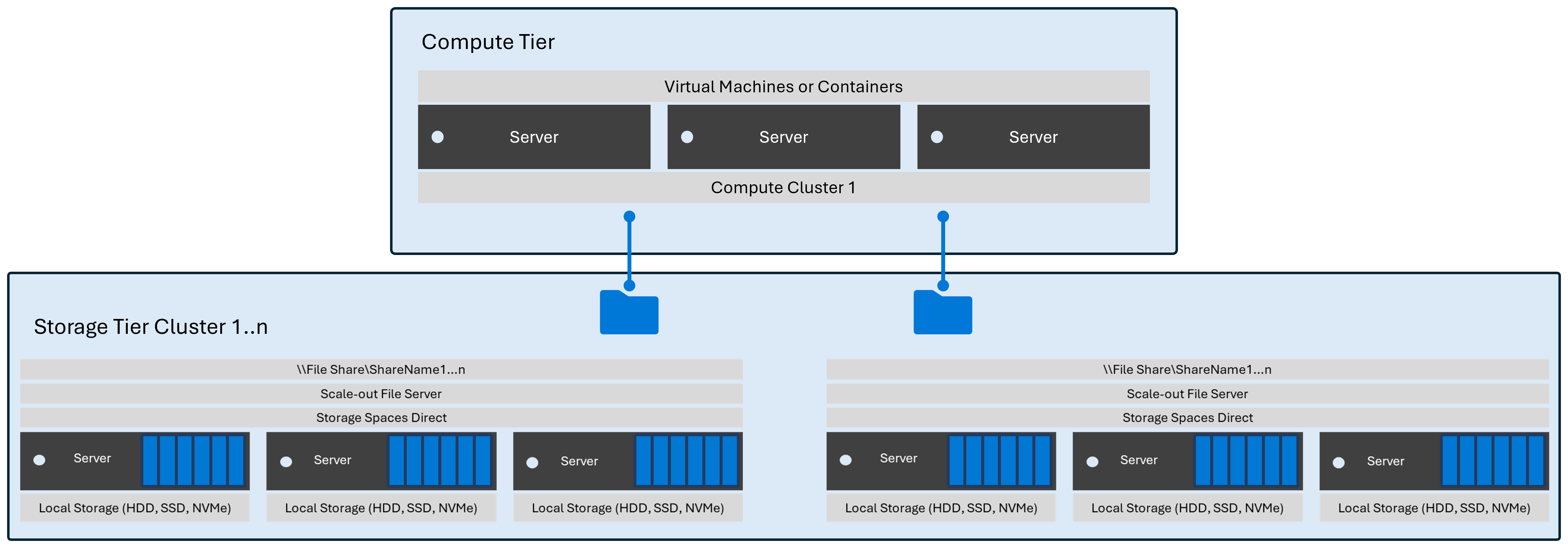 In this configuration, you install Hyper-V and Storage Spaces Direct in separate clusters and access the VMs' configuration and storage over the network.
