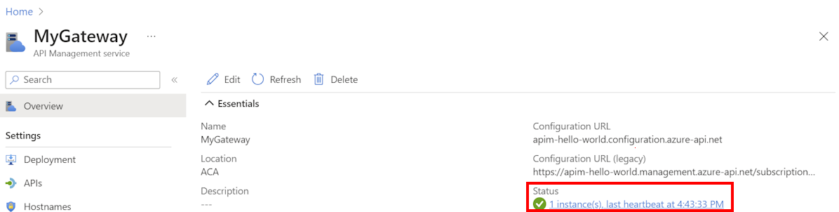 使用容器应用中运行的自托管网关的 FQDN 来调用 API。 在 Azure 门户的容器应用的 “概述 ”页上找到 FQDN,或运行以下命令 az containerapp show 。