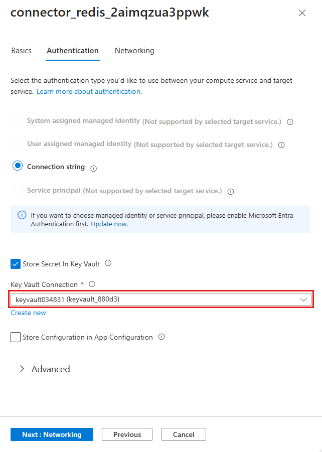 部署已为您生成了作为 应用设置 的连接变量。 安全最佳做法是完全将机密从应用服务中保留出来。 将机密移动到密钥保管库,并在服务连接器的帮助下将应用设置更改为 Key Vault 引用 。
