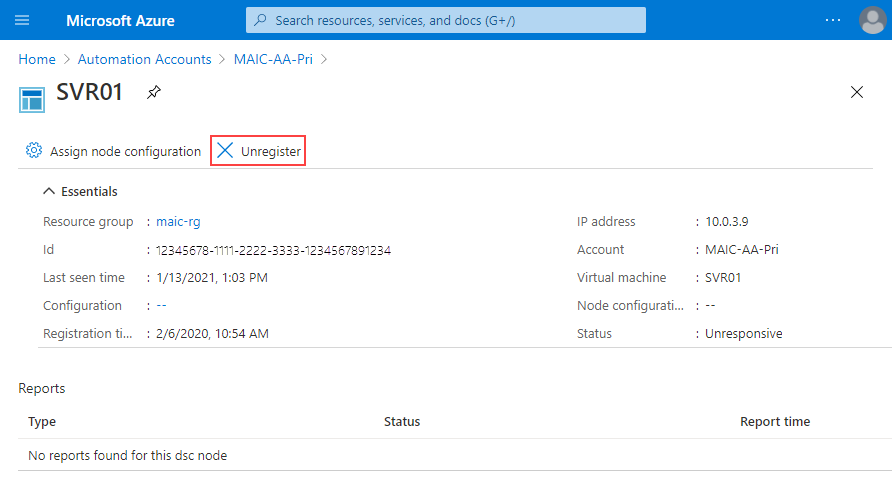 如果不再需要使用 DSC 来管理节点,可以按照以下步骤在 Azure 门户中或通过 Azure PowerShell 将其注销。