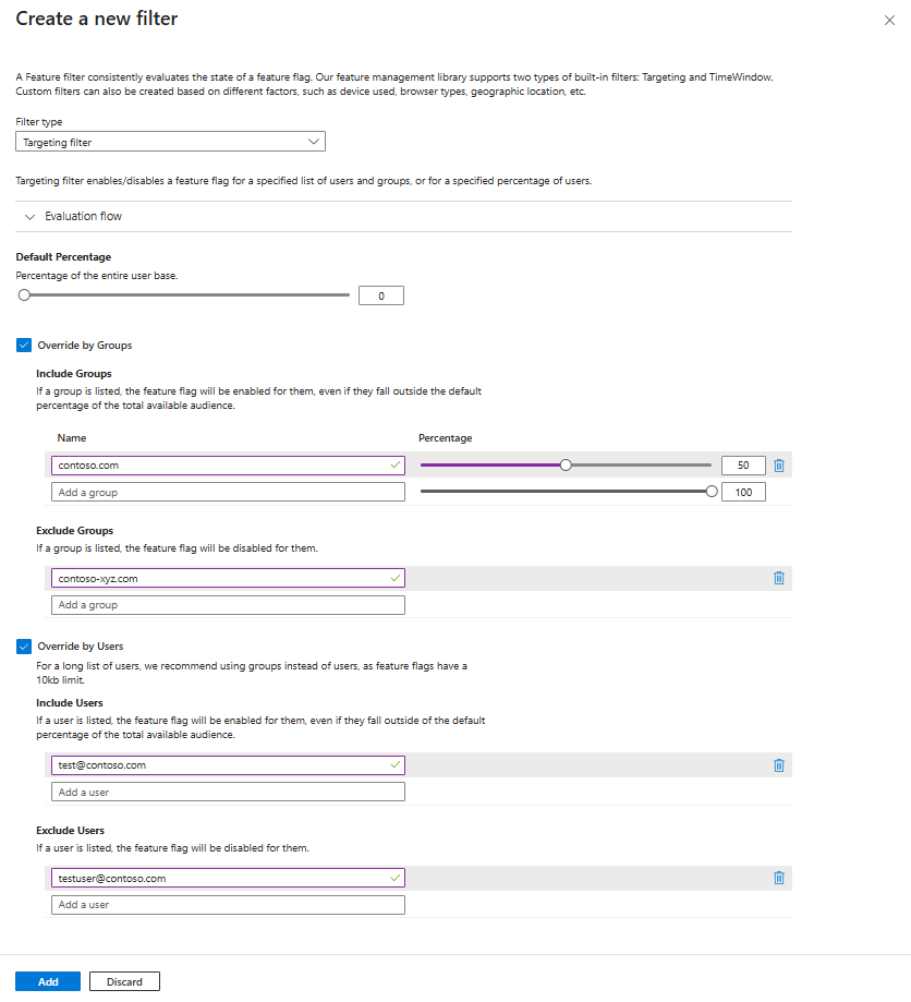• 为组中 50% 的用户 contoso.com 启用功能标志,因为在 contoso.com包含组 ”部分中列出了百 分比50