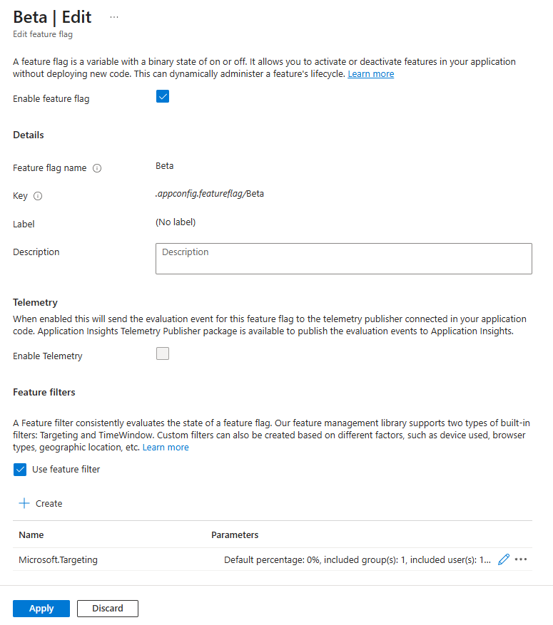 1. 在应用配置存储中创建名为 Beta 的功能标志,并打开它进行编辑。 有关如何添加和编辑功能标志的详细信息,请参阅 “创建功能标志 ”和 “编辑功能标志”。
