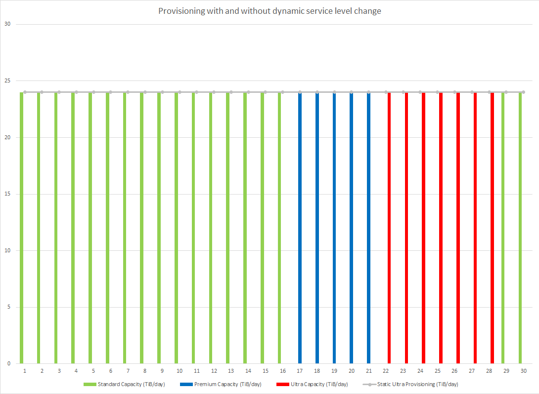 假设容量要求为恒定的 24 TiB。 但是性能需求波动,先是 384 小时(16 天)标准服务级别、120 小时(5 天)高级服务级别、168 小时(7 天)超级服务级别,然后回到 48 小时(2 天)标准服务级别性能。 在这种情况下,动态云消耗部署配置文件看起来与传统的静态本地消耗配置文件不同: