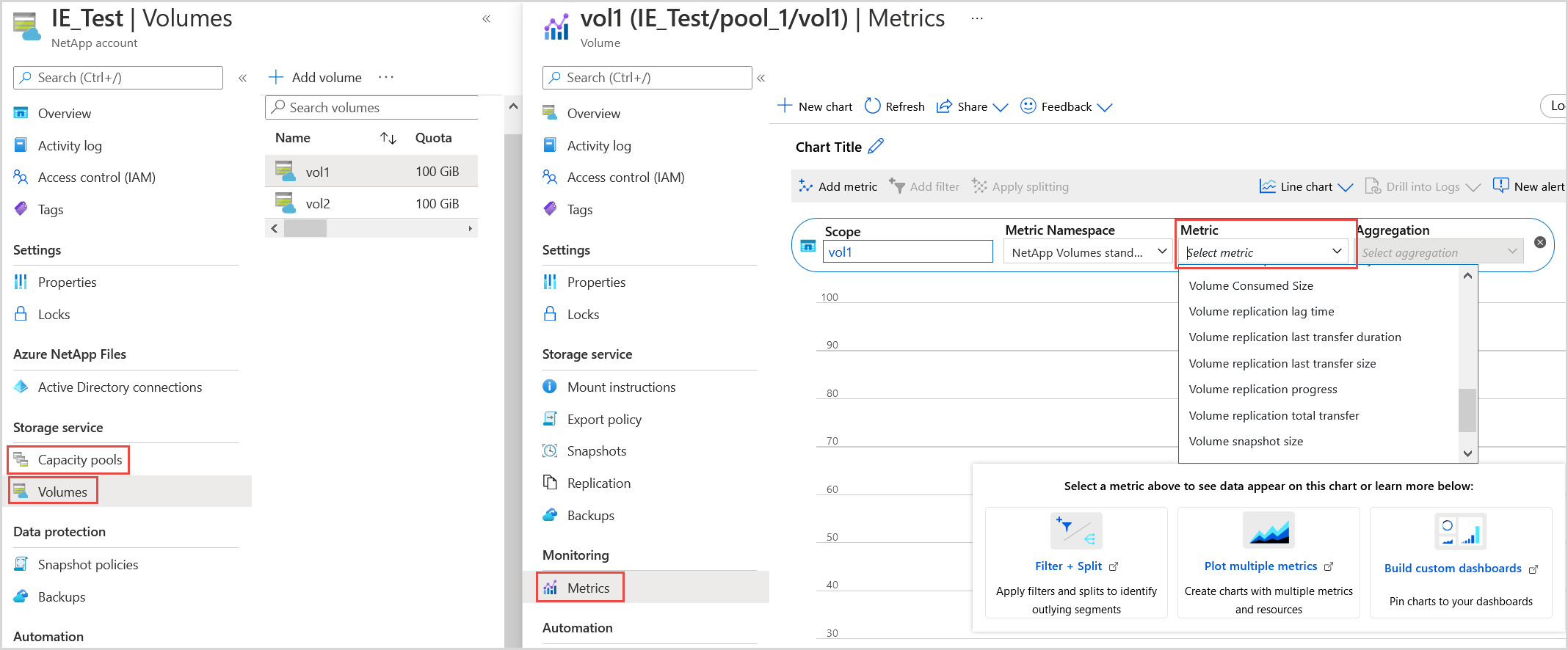 在 Azure Monitor 中,选择“指标”,然后选择一个容量池或卷。 然后选择“指标”以查看可用指标: