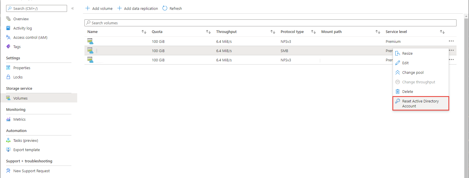 - 导航到卷的“概述”菜单。 选择“重置 Active Directory 帐户”。