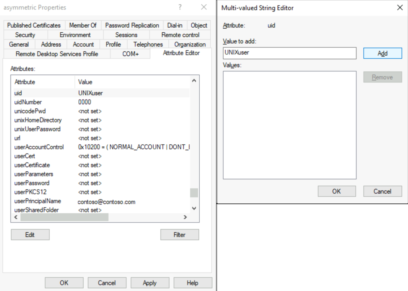 在以下示例中,用户的 Windows 名称为 asymmetric,需要映射到 UNIX 标识 UNIXuser。 若要在 Azure NetApp 文件中实现此操作,请打开 Active Directory 用户和计算机 MMC 的实例。 然后,找到所需的用户并打开属性框。 (这样做需要启用属性编辑器)。 导航到“属性编辑器”选项卡并找到“UID”字段,在“UID”字段中填充所需的 UNIX 用户名 UNIXuser,单击“添加”,然后单击“确定”进行确认。