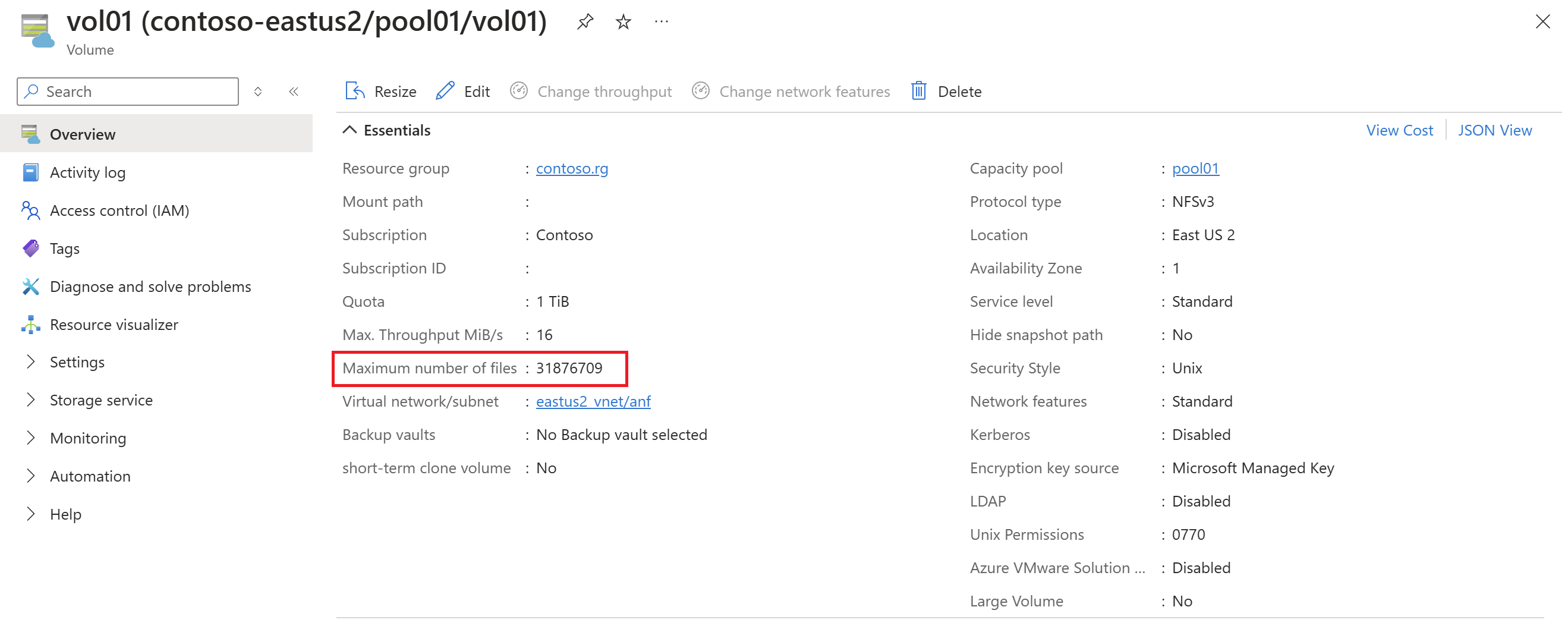 如果要增加卷的 maxfiles 限制,必须增大卷的大小。 如果卷已达到最大大小,但仍需要增加 maxfiles 限制,请联系 Microsoft 技术支持团队。