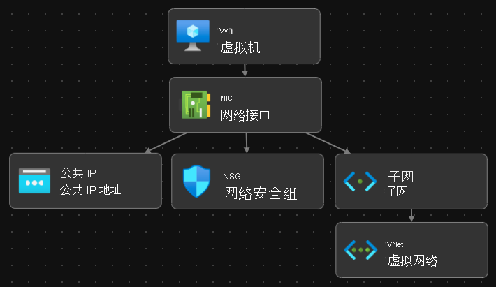 Bicep 可视化工具显示 Bicep 文件中定义的资源及其之间的依赖关系。 下图是适用于 Linux 虚拟机的 Bicep 文件的可视化表示形式。