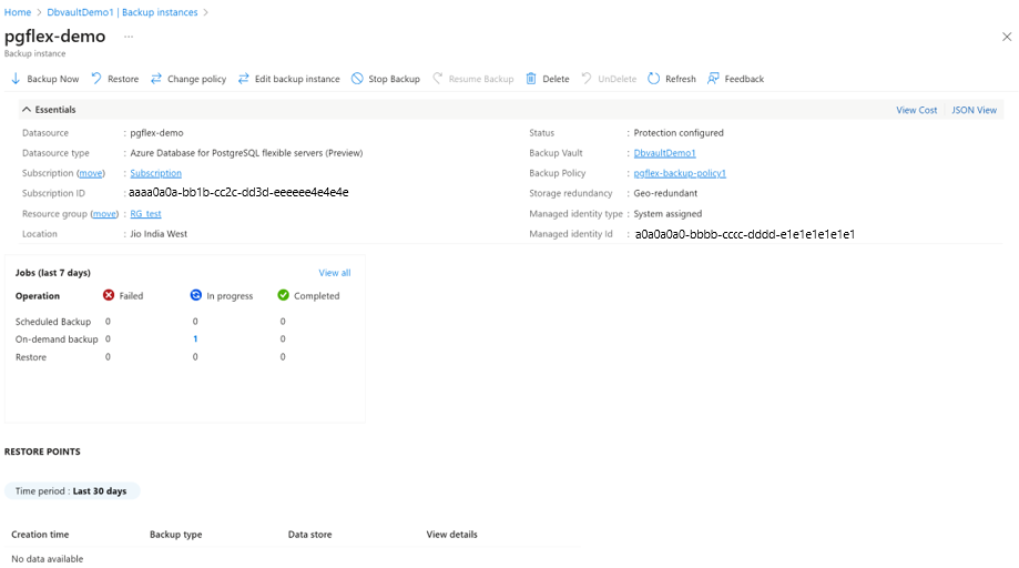 转到 “备份实例 ”窗格。 它会显示“作业”仪表板,其中包含过去七天的操作和状态。