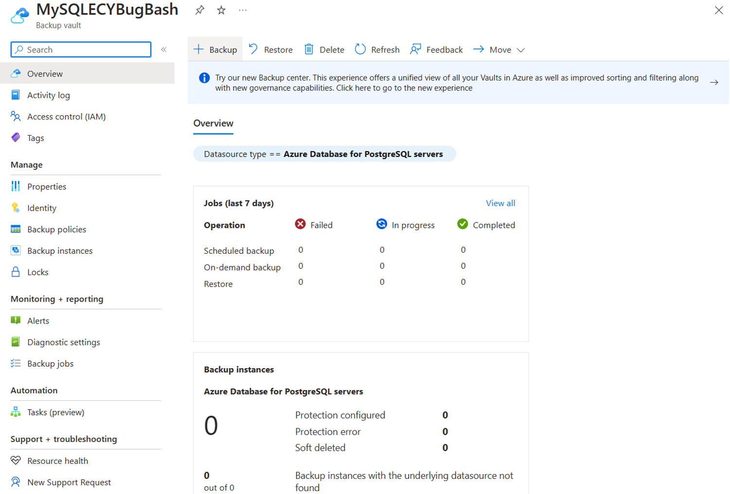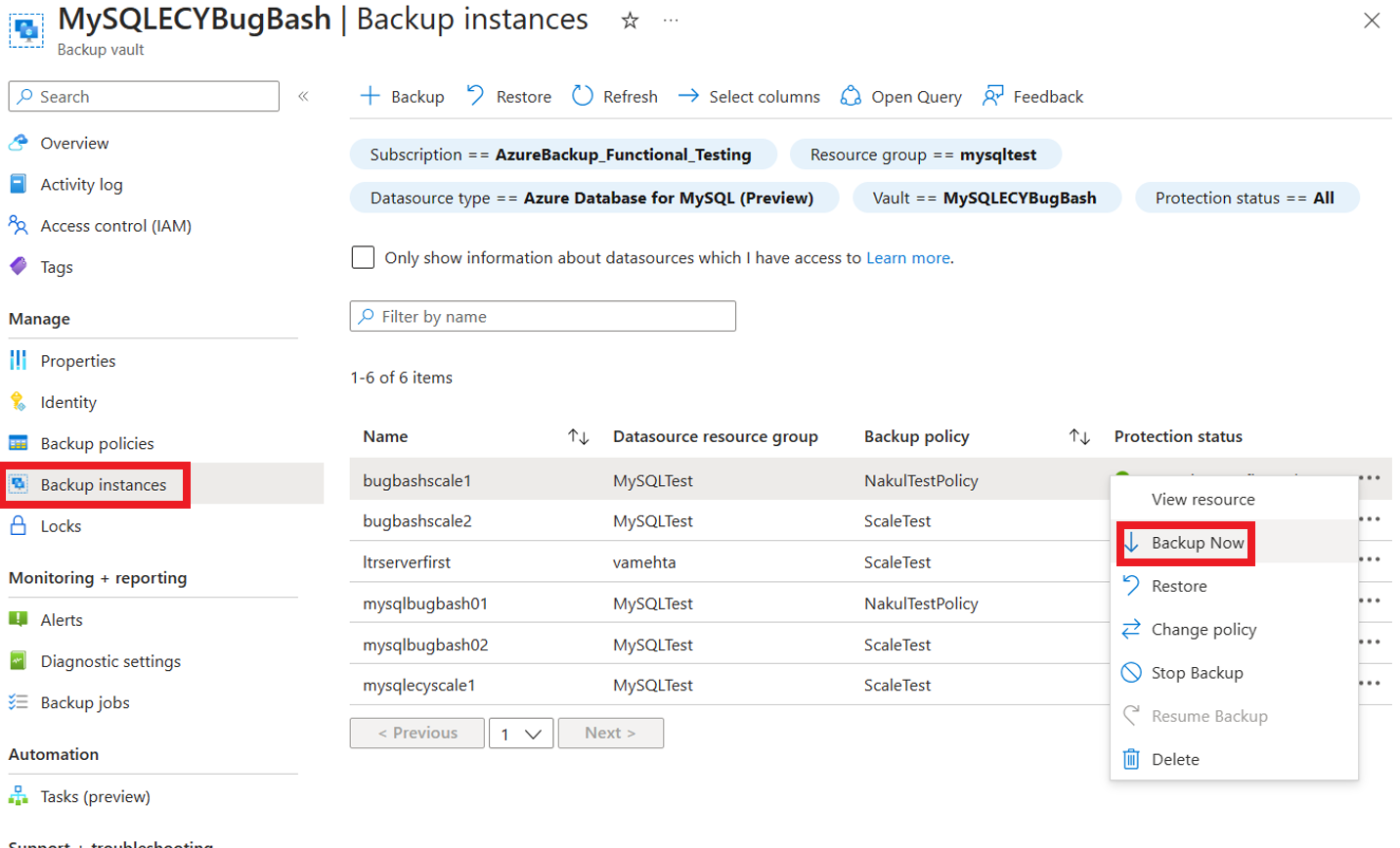 使用 Azure 备份保护 Azure Database for MySQL 灵活服务器的预览版解决方案目前已暂停。 在收到进一步通知之前,请不要配置新备份。 请放心,所有现有备份数据仍然安全,可用于还原。 与此同时,你可以参阅博客文章说明来手动创建长期备份,确保满足即时需求。