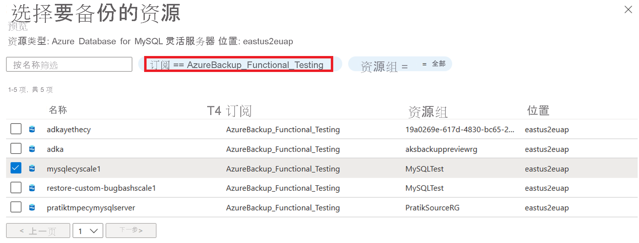 选择要备份的 Azure Database for MySQL - 灵活服务器实例。