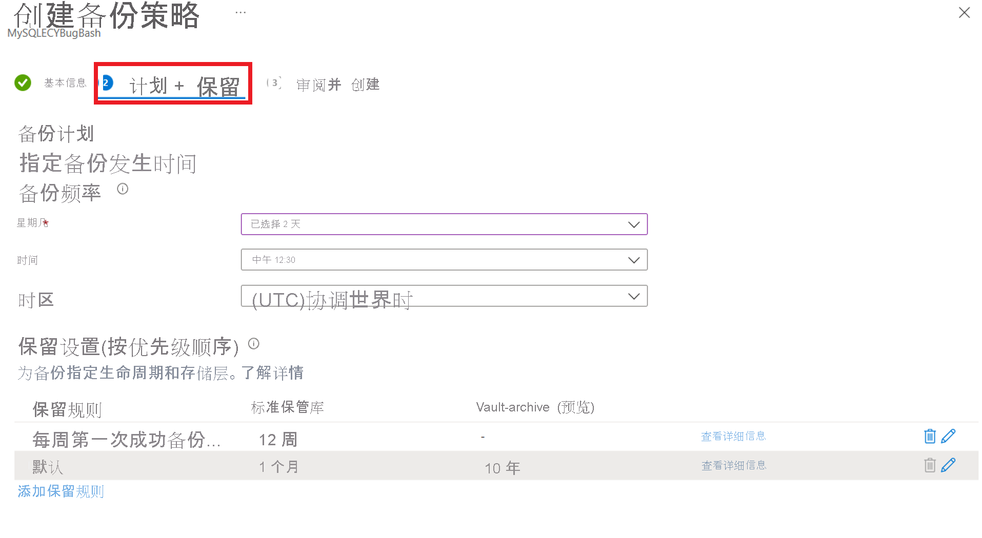 在“计划 + 保留”选项卡上,选择“备份计划”值。