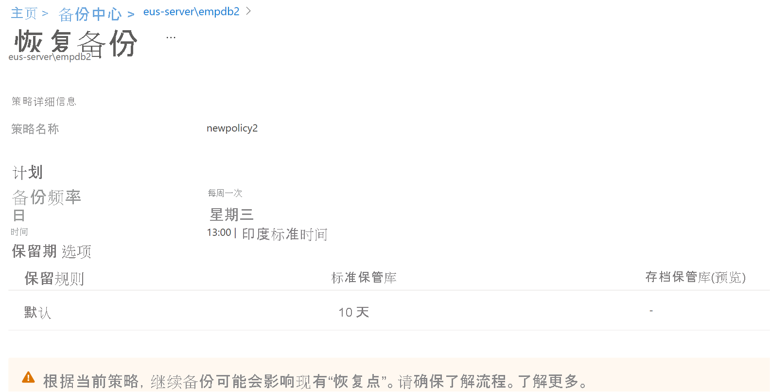 恢复保护备份实例时,现有备份策略将开始应用于新的恢复点。 根据创建时生效的备份策略定义的原始保留期,清理已过期的恢复点。