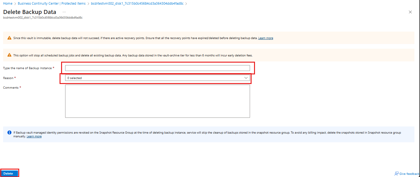 在 “删除备份数据 ”窗格中,输入确认详细信息,包括备份实例的名称、删除原因和其他注释。