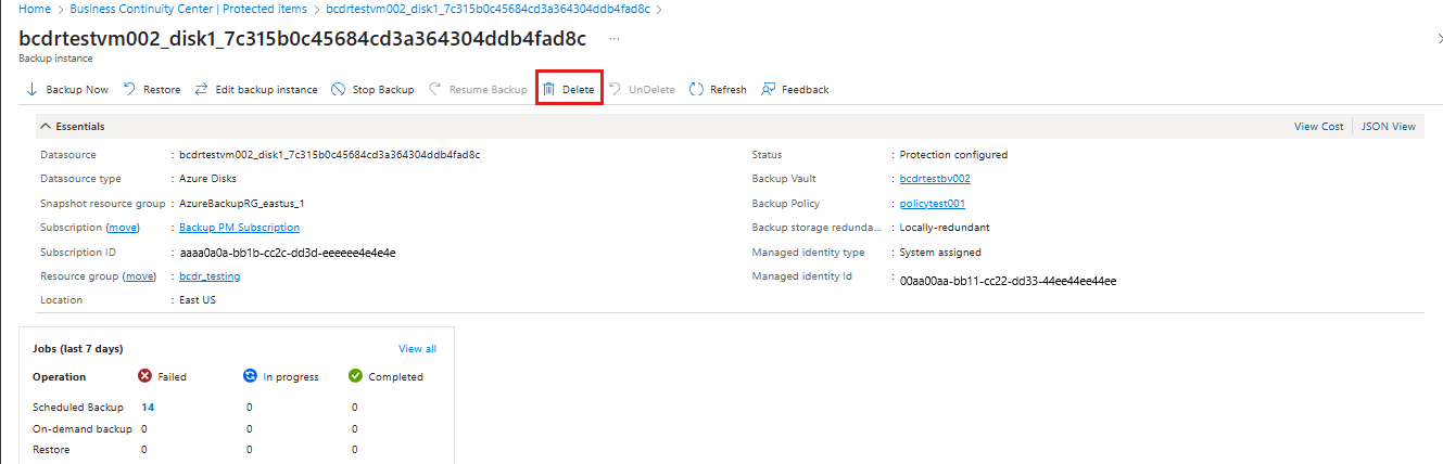 如果手动删除了快照资源组或者撤销了对备份保管库托管标识的权限,则删除备份实例将会失败。 如果发生这种失败,请临时创建同名的快照资源组,并按照此文档中所述,为备份保管库的托管标识提供所需的角色权限。 可以在“备份实例”屏幕的“基本信息”选项卡上找到快照资源组的名称。